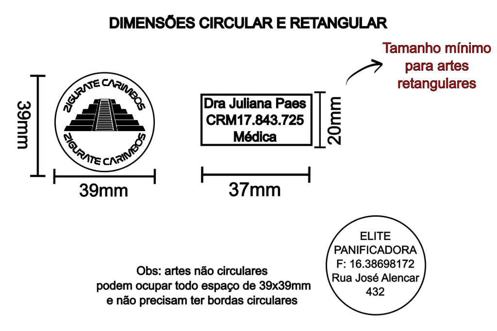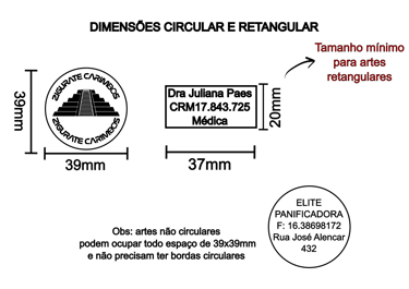 O carimbo Superball tem uma área útil de impressão circular de 39mm, e para logos retangulares devem ter o mínimo de 37x20.